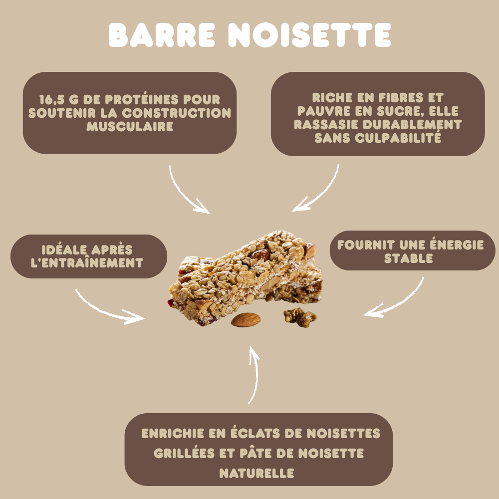 L’incroyable saveur de noisette de notre barre protéinée, un délice croquant et gourmand qui réveillera vos sens à chaque bouchée.