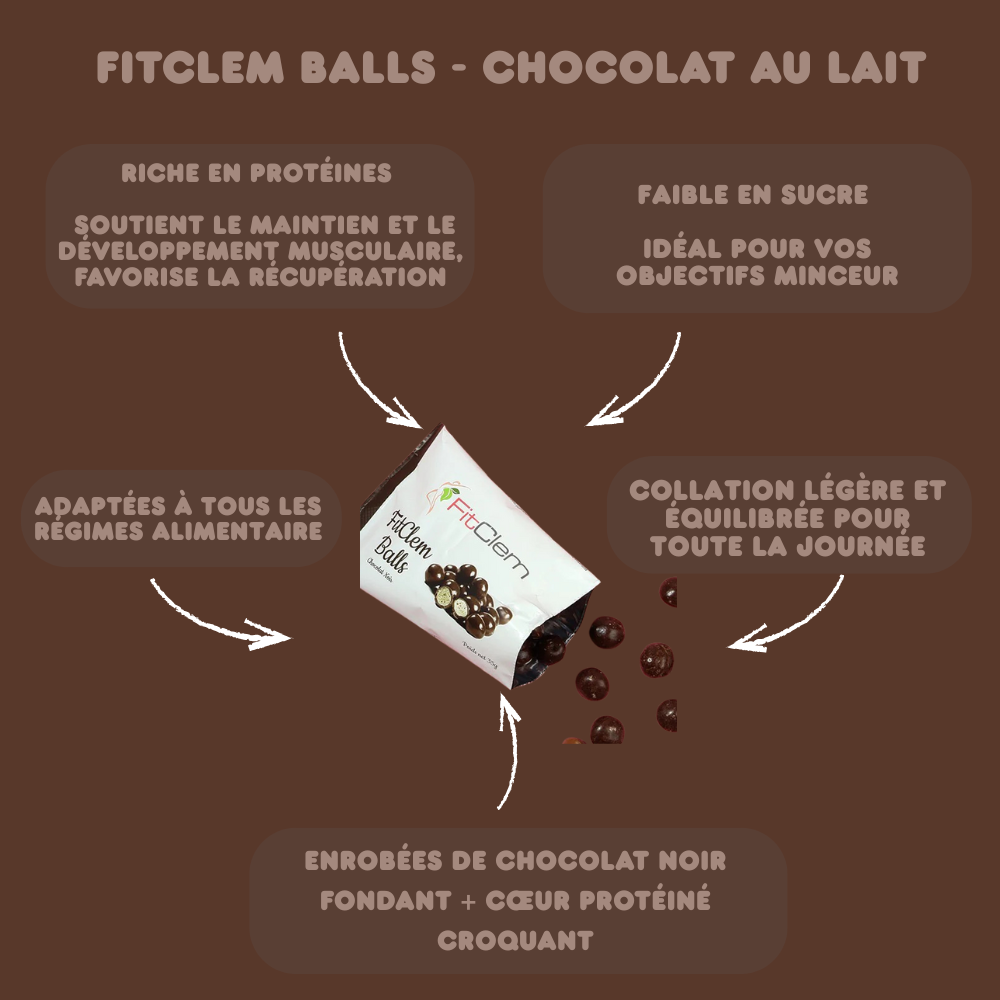 Les FITCLEM BALLS sont des billettes protéinées enrobées de chocolat noir, alliant plaisir intense et équilibre nutritionnel. Elles sont idéales pour un en-cas sain, gourmand et rassasiant à tout moment de la journée.