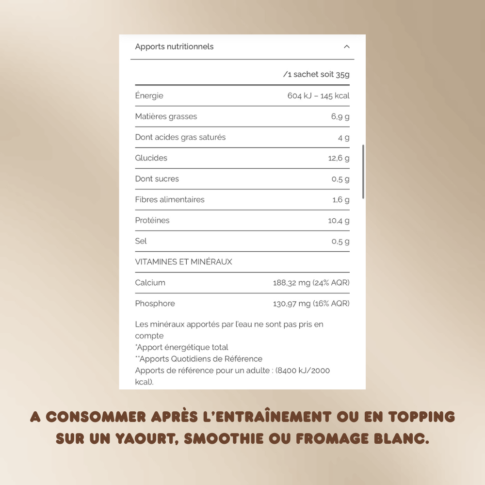 Peut aussi être ajouté en topping sur un yaourt, smoothie ou porridge pour un plaisir gourmand et équilibré.