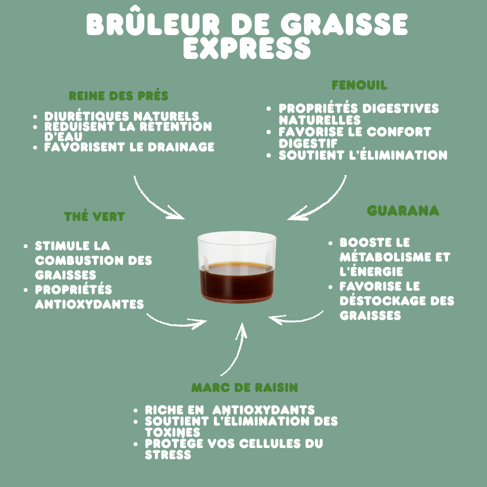 Brûleur de Graisse Express est une boisson hautement concentrée en caféine et enrichie de six actifs végétaux, dont le thé vert et le guarana, qui favorisent une dégradation rapide des graisses.