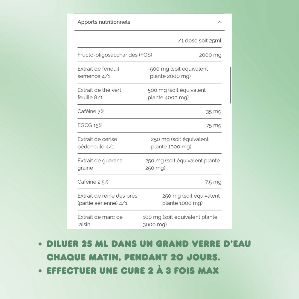 Composée de fenouil, thé vert, marc de raisin, pédoncule de cerise, guarana et reine des prés, elle combine des propriétés digestives, antioxydantes, diurétiques et stimulantes.