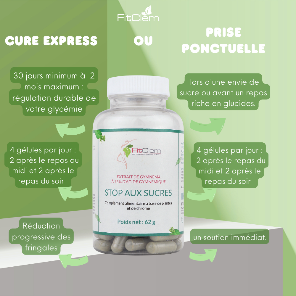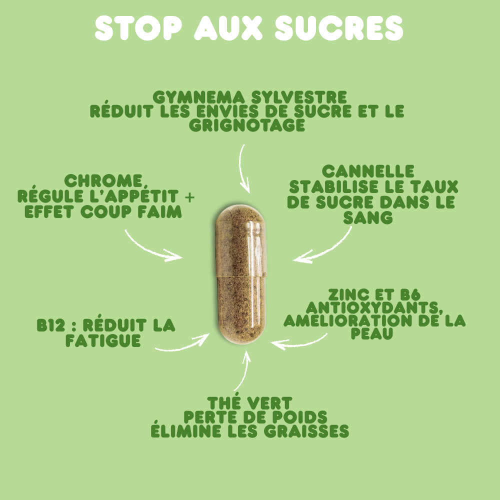 - Contrôle de la glycémie : Stop aux Sucres régule l'appétit et diminue l'apport calorique, réduisant ainsi les envies de sucre et stabilisant les niveaux de glucose dans le sang.