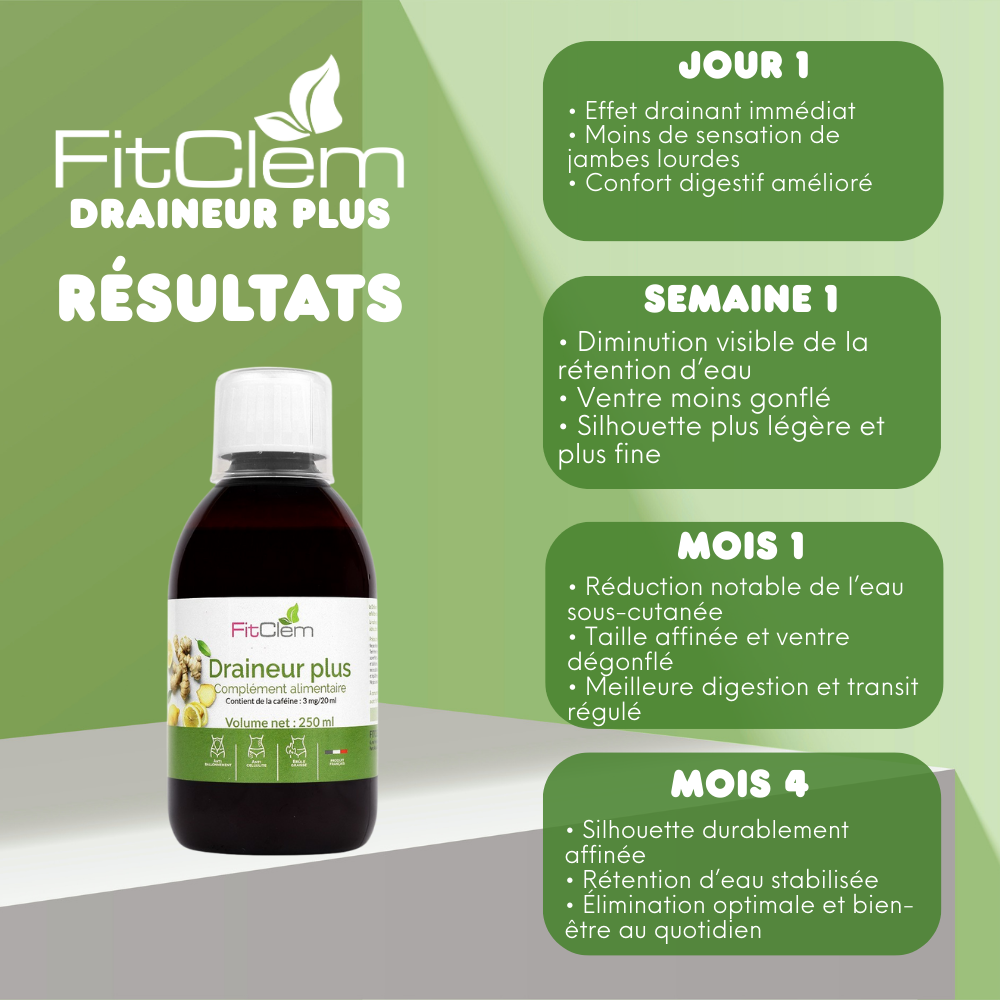 Sans alcool et végan, le Draineur Plus garantit pureté et efficacité dès la première consommation.