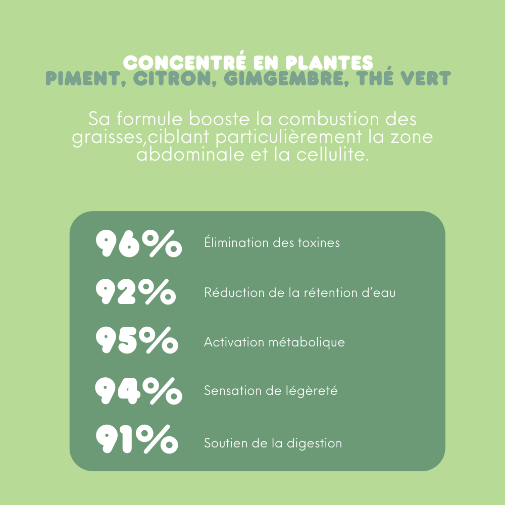 Elle agit efficacement sur la zone abdominale en favorisant la combustion des calories, la réduction de la rétention d’eau et lutter contre la cellulite. Sa composition naturelle, enrichie en extraits de plantes sèches et en caféine dosée avec précision, stimule l’énergie.