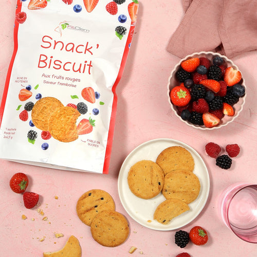 Avec 11,5g de protéines par sachet, nos SNACK BISCUIT fruits rouges incarnent la gourmandise saine et équilibrée.
