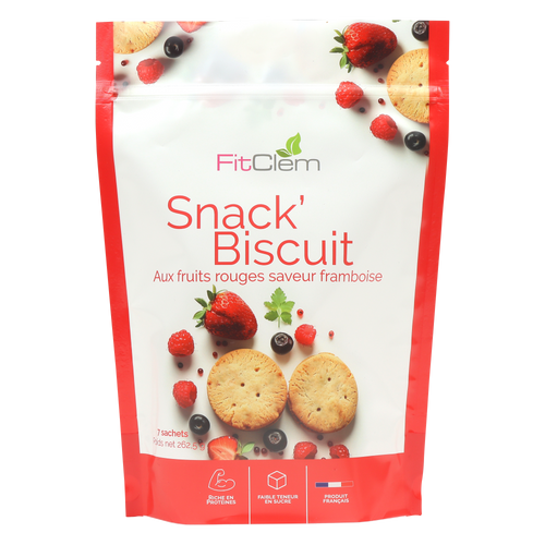 Les Snack Biscuit FitClem Fruits Rouges – saveur framboise allient plaisir et nutrition avec 11,5 g de protéines par sachet. Riche en goût, pauvre en sucres, et formulé pour offrir une énergie durable et un équilibre parfait entre gourmandise et bien-être.
